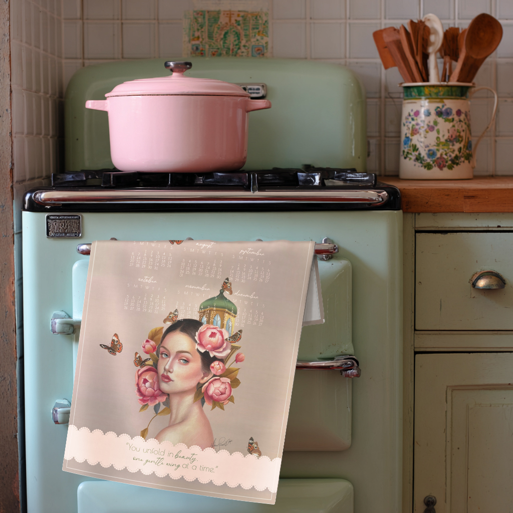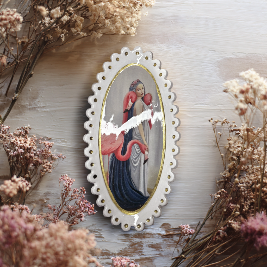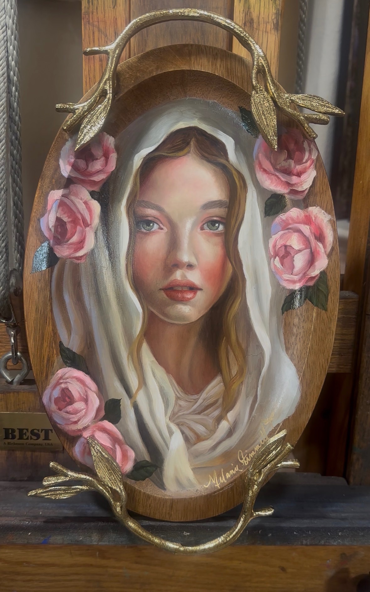 Painted in oil on a carved wooden tray from India, this intimate piece transforms a simple object into a sacred heirloom. A reminder that beauty unfolds in its own time, without rush or demand. The tray’s golden handles frame her like an offering, creating a piece that is both art and altar, elegance and devotion.