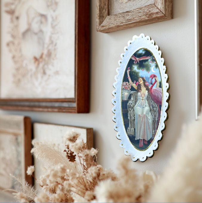 Delicate oval wall pieces with The Goddess of Winged Creatures at their heart, framed by scalloped edges and kissed with gold.  A keepsake to adorn your sacred space.